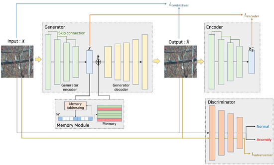 Structure of the proposed AE-based model. The model consists of a generator, a memory module, an encoder, and a discriminator. The generator encodes the input image into a latent spatial vector , and combines similar latent vector through a memory module to generate a reconstructed image. The encoder and discriminator receive reconstructed images to distinguish normal from abnormal images. , , and are loss functions used improve the model’s performance with context, encoder, and adversarial learning, respectively.