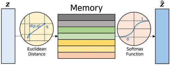 The structure of the memory module involves measuring the similarity between the input vector and the memory items and selecting the memory item with the most similar pattern. The selected memory item is combined with the input vector to generate a sophisticated latent-space vector , which is finally transmitted to the generator decoder. Mathematically, the similarity between the input vector z and a memory item can be defined as follows: