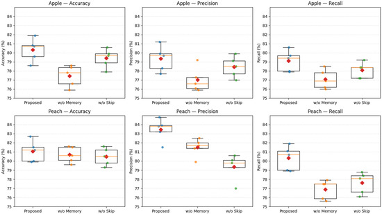 Ablation study boxplots on apple (top row) and peach (bottom row) datasets for accuracy, precision, and recall across 5-fold cross-validation. The three variants—Proposed model, w/o Memory (Ganomaly), and w/o Skip (MemAE)—are compared. Boxes denote the interquartile range, whiskers indicate the overall range, and diamonds represent fold means. The results highlight that the memory module mainly improves recall, while skip connections enhance precision, leading to the most balanced performance when both are integrated in the proposed model.