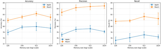 Trade-off analysis of memory module size (128, 256, 512, 1024) on apple and peach datasets. Each curve shows mean accuracy, precision, and recall with standard deviation across 5 folds. Smaller sizes reduce recall due to limited representation, while very large size (1024) increases redundancy and computational cost without consistent gains. The configuration with 512 items achieves the best balance between detection performance and efficiency.