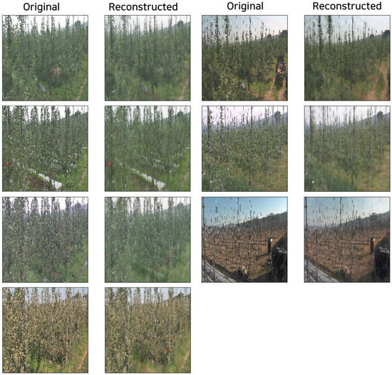 Figure 7 and Figure 8 present the reconstruction results for the undamaged and damaged data, respectively, using the proposed model. For undamaged data, the model successfully reconstructed images that closely resembled the original images, thereby accurately capturing the characteristics of healthy crops. In contrast, for the damaged data, the reconstructed images exhibited significant differences from the original images, particularly in areas where the damage was most pronounced. These discrepancies indicate the sensitivity of the model to anomalies, aligning with the objective of the AE approach, where the model, trained primarily on undamaged data, detects anomalies by struggling to accurately reconstruct them.