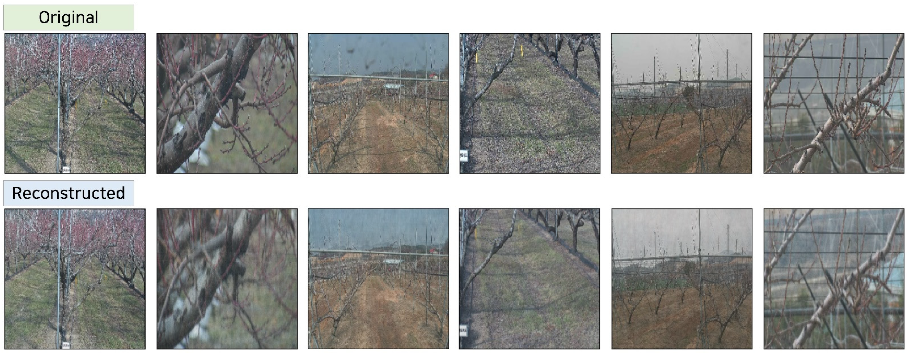 Figure 7. Reconstruction results of undamaged crop images using the proposed Memory Ganomaly model. The reconstructed outputs closely resemble the original images, successfully preserving fine-grained visual details such as leaf structure and fruit texture. This demonstrates the model’s ability to accurately capture and reproduce normal crop conditions.