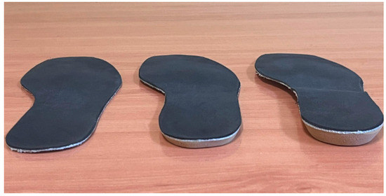 For data collection, first of all, we fabricated insoles with varying drops to be studied. The insoles used in this study were custom-fabricated with varying drop heights. Each consisted of a 1.9 mm rigid resin base, a layer of high-density EVA with a Shore A hardness of 70° for drop simulation (5 mm and 10 mm), and a 1 mm micro-perforated top cover for comfort and breathability (Figure 1). The EVA material was selected for its mechanical properties, including high resilience, shock absorption, and deformation resistance, all relevant in simulating realistic gait conditions. The insoles were designed to fit snugly into the shoe, ensuring a stable placement during walking trials.