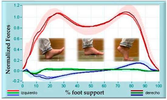 The results showed that the maximum and minimum vertical ground reaction forces were similar in both feet, although slightly higher in the right foot. This finding in consistent with previous studies, such as Peters (1988), who attributed these differences to limb dominance [20]. Since gait is a complex action involving biomechanical and neurophysiological factors, the absence of significant bilateral differences allows us to consider the gait pattern symmetric in our sample [21,22].