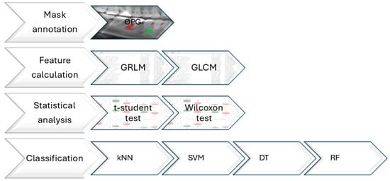 The study was designed to utilize OPG input images to assess the structure of periodontal inflammatory changes based on texture analysis. The study workflow is presented in Figure 1 and includes the following steps performed on the input images: mask annotation, texture feature extraction, statistical analysis, and image classification.