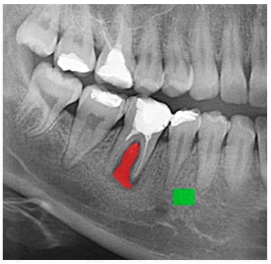 The masks representing healthy and periodontal inflammatory changes in tissues were manually annotated (Figure 2). An expert clinician with specialized training performed the annotation. The masks segmented each image into ROIs representing the area of study. The masks were annotated using qMaZda software version 4.6 [30,31].