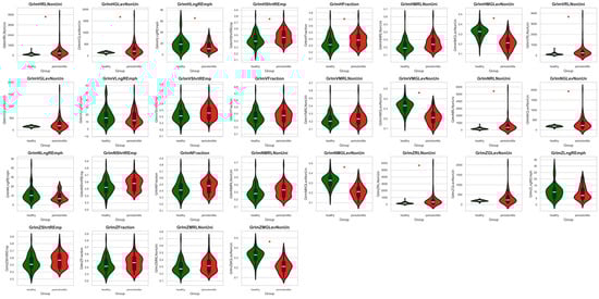 Features of gray-level run-length matrix (GRLM) averaged across analysis directions comparing between the healthy tissue and periodontitis tissue groups. Differences between groups are indicated with a red star when p < 0.05.