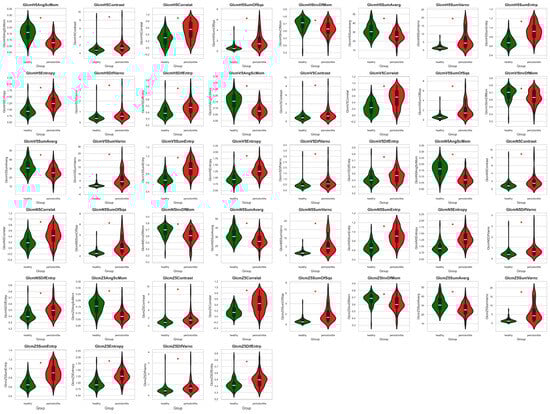 Among the 72 texture features extracted from different directions (H, V, N, and Z) using GRLM and GLCM, 66 features showed significant differences between healthy and periodontitis tissues. The values of all examined texture features with a marked significant level are presented in Figure 3 and Figure 4.