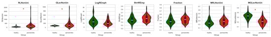 Features of gray-level run-length matrix (GRLM) comparing between the healthy tissue and periodontitis tissue groups. Differences between groups are indicated with a red star when p < 0.05.