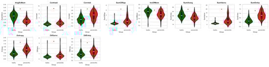 Features of the gray-level co-occurrence matrix (GLCM) comparing between the healthy tissue and periodontitis tissue groups. Differences between groups are indicated with a red star when p < 0.05.