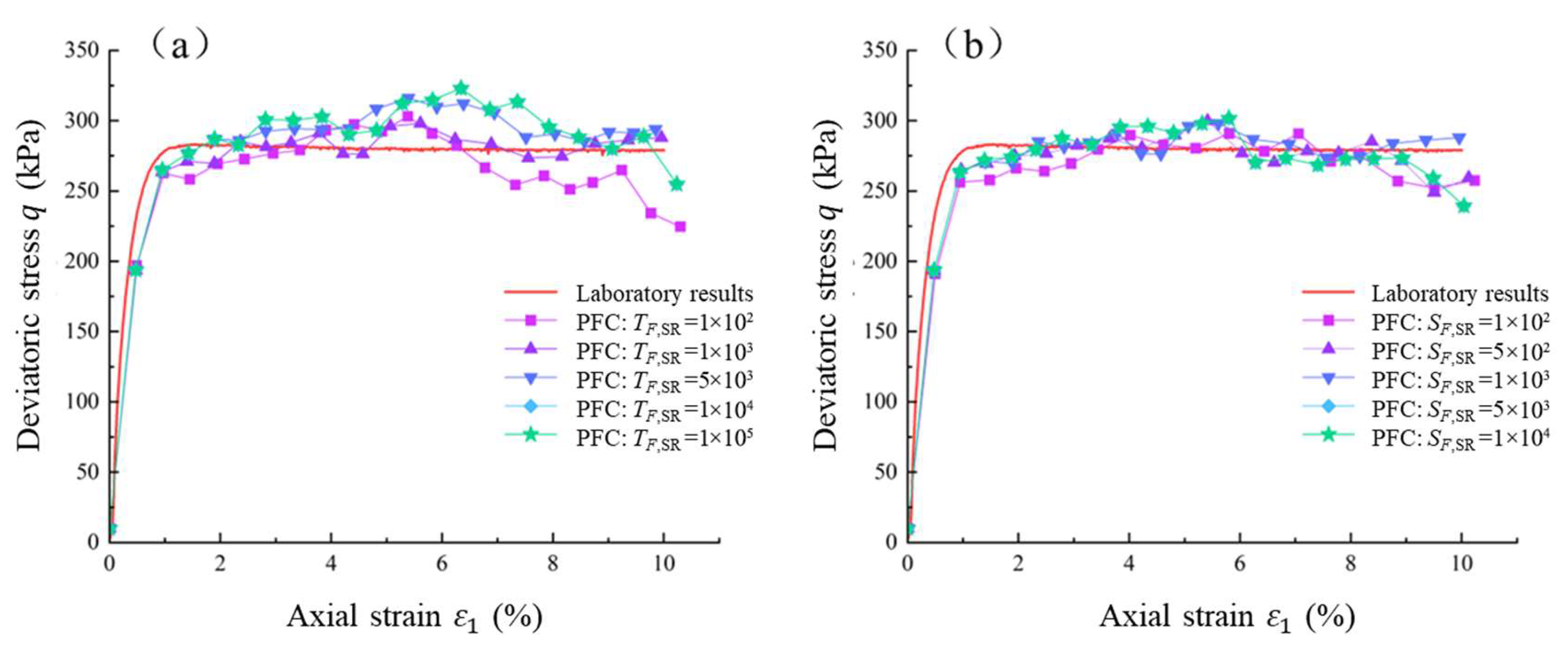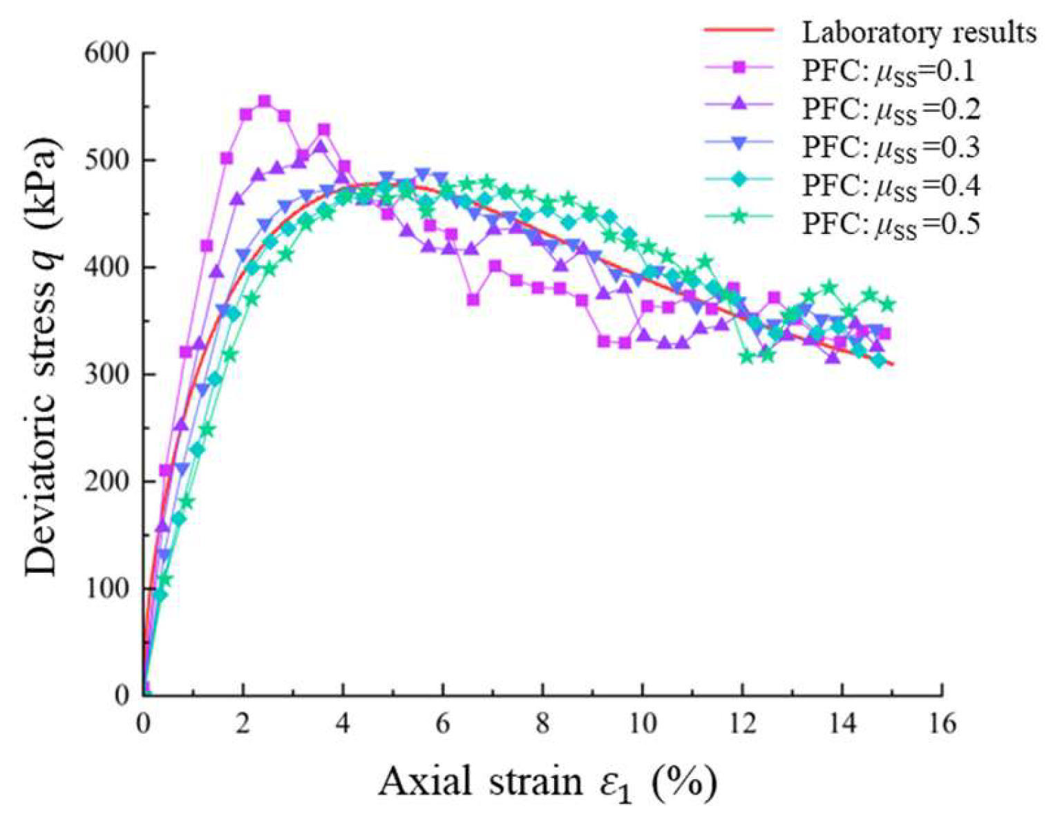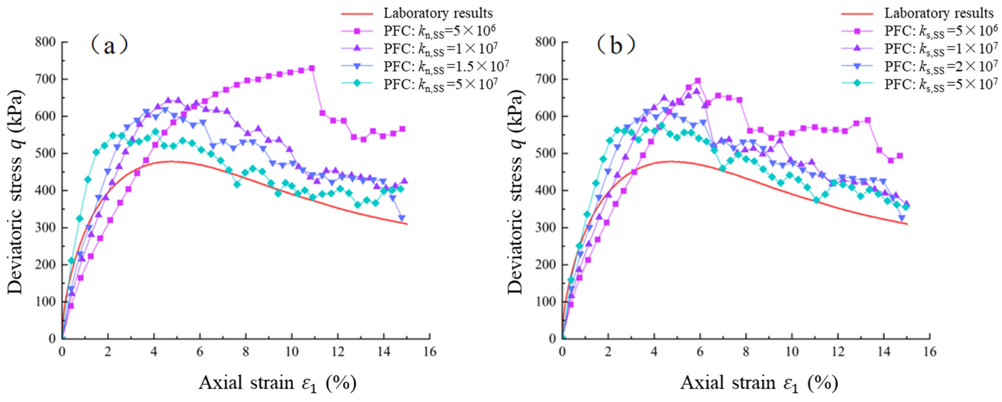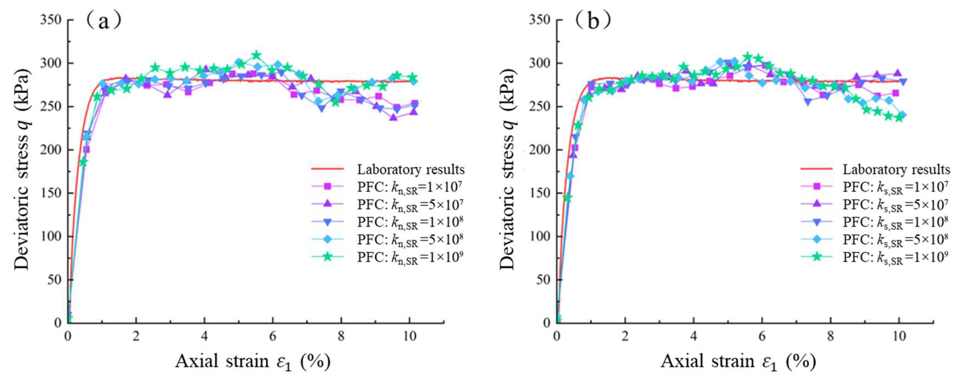 - For the pure clay matrix, contact stiffness and the friction coefficient were found to govern the initial tangent modulus, peak stress, and residual strength. In contrast, the bond strength parameters (normal and shear) primarily influenced the peak and residual strengths without affecting the initial stiffness, confirming their role in defining the material’s cohesive strength. A reliable set of mesoscopic parameters for the clay matrix was successfully calibrated against experimental data.