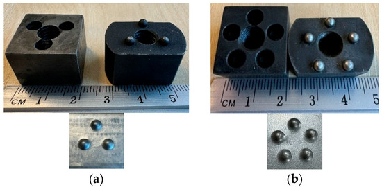 A TECNA Series 8005D electric resistance welding machine was used for welding (maximum welding power 200 kVA, maximum welding current for steel 28 kVA). For the experimental program, pairs of electrodes made of Cu-Cr-Zr alloy (high-strength age-hardened material 2.1293-CW106C for manufacturing spot electrodes), having a flat face and a working surface of 25 mm × 25 mm, were used. For the first experiment set (16 pairs of samples), three protrusions were made simultaneously on the steel sheets with a 1.2 mm thickness, using a punch and a steel tool mold (Figure 1a). For these types of samples, the distance between the protrusions’ axes was approximately 10 mm. Then, using another mold and a punch having five pins, a second set of 16 pairs of samples having five protrusions have been made, having between axes distances of 13 mm (Figure 1b).