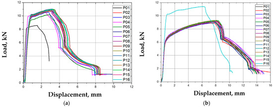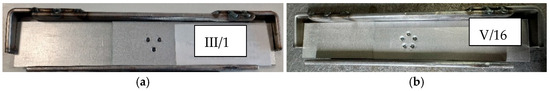 As can be easily seen from the stress–strain diagrams (Figure 8), the values of the maximum breaking forces are grouped and have close values, for most of the samples. Furthermore, as a rule, the breaking deformation in the case of samples welded with five protrusions is approximately double compared with samples with three protrusions, for the same values of the welding regime parameters. Among all the samples welded with three protrusions, the most unfavorable combination of welding parameter values was obtained for sample III/1, where the rupture occurred at only 8.58 kN, and the deformation at rupture was the lowest (1.53 mm). Additionally, among the samples welded with five protrusions, the most favorable situation was recorded for sample V/16, where the rupture force reached the highest value among all the welded samples (11.40 kN).