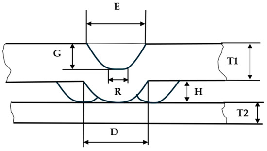 The desired diameter of the molten core depends on the correct adjustment of the intensity of the welding current as a function of time. The cross section of the weld point is a measure of the quality of the joint, directly influencing the value of the breaking force [21,22]. Research on low-carbon steels has shown that adequate weld spot breaking strength values can be obtained by simultaneously making several small diameter spots [14,23]. If the time is short, the diameter of the core is too small, and if the time is long, the amount of molten metal increases and is projected outside the working area, with the consequence of decreasing the joint strength [24,25,26,27].