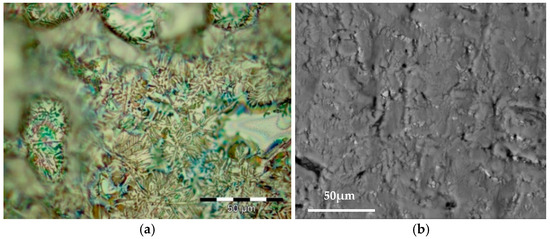 Optical and SEM analysis performed on the surface of the aluminized sheet indicated a quasi-uniform dendritic aspect of the aluminum layer, without cracks or exfoliation (Figure 4a,b).