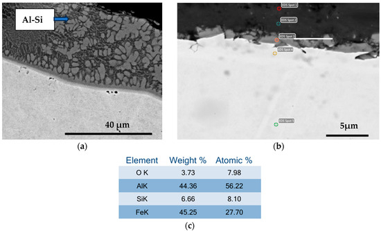 SEM analyses of the Al-Si alloy protective layer indicated an average thickness of 30 μm that was sufficiently compact, having a dendritic microstructure (Al-Si), a continuous interface and good adhesion to the steel substrate (Figure 5a). The EDS analysis of the chemical composition carried out on the cross section revealed, in the aluminized layer, the presence of aluminum as the majority element (over 88 wt.% Al), together with oxygen from aluminum oxide O (7.90 wt.%), Si (2.90 wt.%) and Fe (1.20 wt.%) (Figure 5b).