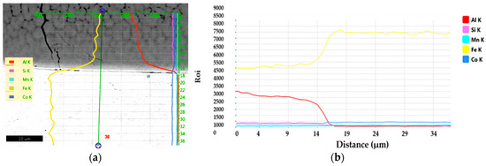 Element profile plot through the interface between the coating layer and steel substrate for sample III/2: (a) distribution of chemical elements through the covering layer (Al-Si) and steel substrate; (b) individual distribution of main elements (Al, Si, Mn, Fe, Co) along the crossing line through the interface.