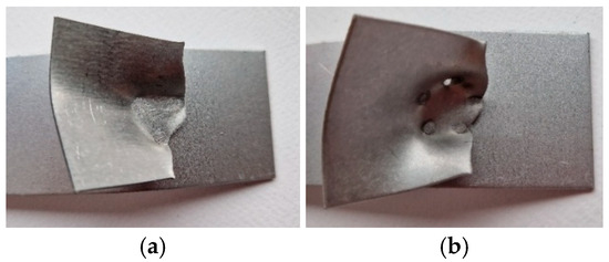 To maintain uniform heating conditions, the pressing force of the electrode must be gradually increased. High-pressure values cause a decrease in electrical resistance but also an increase in the width of the welded spot, with fewer gaps in the fusion zone. However, excessively high-pressure values can cause the massive expulsion of the molten metal from the welded point and the formation of an unsightly imprint [19]. For welding technology to be accepted, the fracture must occur outside the welded point (in the base material), and the fracture force values must be at least 75% of the tensile strength of the base material [20].