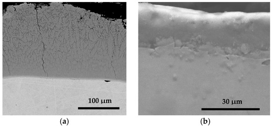Aspect of Al-Si layer coating layer in cross section: (a) cracks developed during welding in III/2 sample; (b) aluminized layer cracks-free (sample III/16).