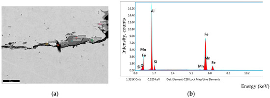 The micro-chemical composition analyses performed with the EDS method indicate the formation of complex compounds. The chemical composition of the compounds accumulated at the welded interface indicates the formation of the Fe-Al2 and Fe-Al compounds, which are found in the Fe-Al binary phase diagram [47]. Studies carried out on Fe-Al powder mixtures have highlighted the formation of intermetallic compounds starting at 600 °C, by the diffusion of aluminum into the iron grains, because aluminum atoms have higher mobility and easily penetrate the boundaries of iron grains [48]. Fe-Al2 solidifies from the melt at approximately 1165 °C, a temperature that can be reached and exceeded in the molten core of the weld. Although the melting and cooling times of the molten zone are very short, the metal pressing during the welding process causes the expulsion and accumulation of these compounds towards the ends of the welded joint. Fe-Al2 is a brittle compound, representing a source of crack initiation, and its accumulation at the periphery of the welded spot area causes a reduction in the strength of the joint.