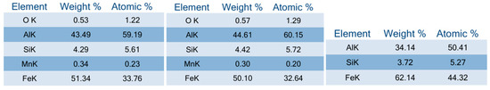 The chemical composition variation on either side of the welded interface is due to mutual diffusion of elements during the welding process. At the interface between the aluminized layer and the base material, the chemical composition contains 1.11–1.22 wt.% Al, 0.94–1.06 wt.% Si, 96.29–96.44 wt.% Fe, 1–1.05 wt.% Co and 0.35–0.54 wt.% Mn (Figure 5a). Near the interface with the substrate, the chemical composition of sample III/2 contains about 44.36 wt.% Al, 6.66 wt.% Si, 7.37 wt.% O and 45.25 wt.% Fe (Figure 5b). From different measurements performed on the samples III/2 and III/16, the results showed that iron had a wide variation in concentration from over 96 wt.% in the steel plate to about 65 wt.% in the coating layer, at about 20 μm distance from the welding interface. The other chemical elements (Al, Si, Mn, Co) had similar values to those determined on the non-welded part (see Figure 6).