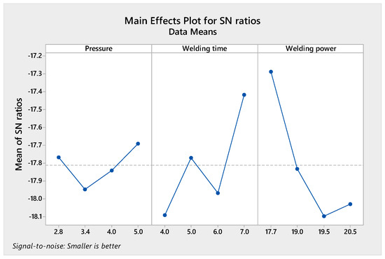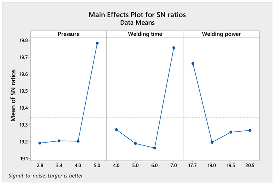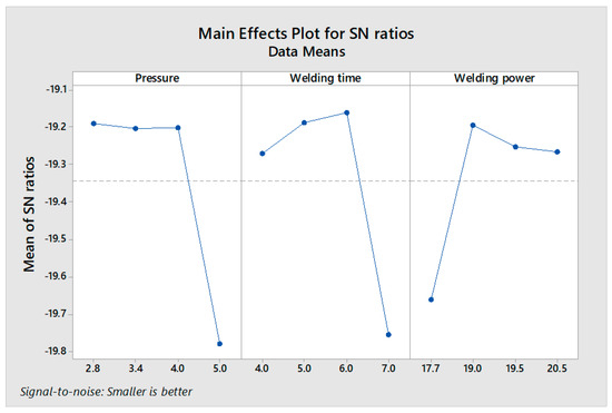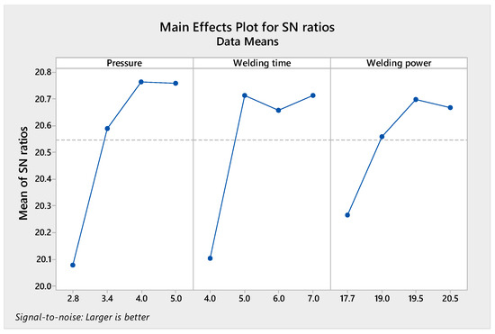 The signal-to-noise ratio (S/N ratio) was analyzed using Minitab 17 software, for the maximum breaking force, wherein a higher S/N ratio indicates a better weld quality characteristic (“larger is better”). The Taguchi method “larger is better” signal-to-noise (S/N) ratio is calculated using Equation (6):