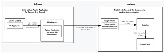 1. The Virtual Reality System that has as subcomponents the Unity Virtual Reality Application, which runs on Oculus Quest 2 and is used as a communication interface for the robotic arm that includes the “Digital Twin” representation of the real arm. And the second subcomponent is the Backend Application that uses Python 3.11 and C# 9 scripts for server-side management in order to send data over the Cloud Server to the robotic arm. The implementation is further explained in Section 3.1.