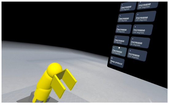 One of the requirements of designing an AR application, as seen in previous work [17,18], is the need to properly calibrate the AR overlay and interaction with the real robot in the physical space. This issue, however, would not appear if the application were switched to VR technology. The main way to use VR for educational purposes and training with robots is to create a replica of a laboratory or the robot itself in the virtual space. This process can be called a “Digital Twin” of a laboratory [19], as in Erdei T. et al.’s study. They digitally recreated an industrial robot laboratory to analyze the impact it can have on training and teaching new students. One of the main reasons for this work is the availability of this technology; with the use of VR, the physical limitations of room capacity and the schedule for the laboratory are removed, and multiple students can be taught in parallel. The laboratory was replicated with the use of Unreal Engine 4, and the test was done on a group of 10 students, of which 5 used the digital laboratory for the training and the other 5 only the standard documentation. The results show that the group that used the “Digital Twin” was significantly faster in solving the given problems compared to the other group. It should be noted that the digital laboratory was not integrated in full VR, and the robot actions in the digital laboratory were controlled from a display screen UI. Another “Digital Twin” approach is mentioned in Tarng et al. [20], which allowed high school students to observe synchronized real-world motion while controlling a virtual model of a real robot.