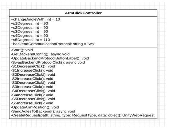 The unity application design (Figure 2) went through multiple development cycles to ensure a friendly user UI. In the last iteration, the user would be shown a virtual chamber with a panel with five rows of buttons, each controlling an arm servomotor. There are two buttons in each row: one for raising the chosen motor’s angle and another for lowering it. Additionally, each button would indicate the angle at which the arm moves if the user presses the button. An additional button was added to the panel to alter the internet protocol. The current protocol will be obtained with a GET request when the VR application loads, and when the user clicks on it, a POST request to modify it will be issued. To show the user how the machine moves when the buttons are pressed, a model of the robot is positioned in front of the button panel.