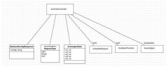The data are sent to the server with the function SendAnglesToBackend, which serializes the angle data before sending it. All of the servomotor angles are included in ArmAnglesData (Figure 4), where J1 is the angle for the first servomotor through J5. The POST request is then created using the backendUrl specified at the script’s top, following the creation of the object. The ArmAnglesData object is serialized into its JSON format by the createRequest method, which then converts it into a byte array and delivers the raw byte array to the backend. The UnityEngine.Networking package is used in the procedure.