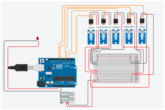 The robotic arm has four MG996R servomotors to manage elbow motion, hand rotation, shoulder movement, and claw control (Figure 5). A Tiankongrc 35 kg servomotor is included to provide support for shoulder rotation and improve stability during operation. The structure is made of 3D-printed parts, which provide cost-effectiveness, design flexibility, ease of modification, and quicker prototyping.