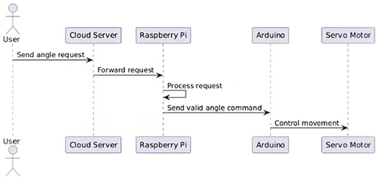 The second Python script “online.py” is the main script that processes the online functionalities and data transfer via Wi-Fi. It can use both the MQTT protocol and the WebSockets protocol. The MQTT protocol ensures efficient communication for fast message delivery. Alternatively, the WebSockets protocol provides a persistent connection that allows real-time control with low latency, enhancing responsiveness during VR control. The control_servo() function is designed to manage the robotic arm’s movement in real-time via keyboard inputs.