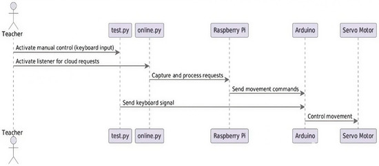 The second diagram shown in Figure 7 follows the Teacher use case. A teacher, depending on the current lesson, will decide on the type of control they want for the robotic arm: manual control from keyboard (made possible with the ‘test.py’ script) or online control from the VR headset (made possible with the ‘client.py’ script). After choosing the type of control desired, the angles are sent to the Arduino to control the servos.