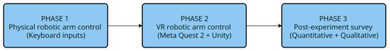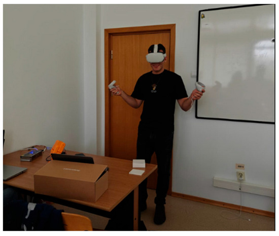 The experiment involved 31 third-year students from the Faculty of Engineering in Foreign Languages (FILS). The group distribution included 19 information engineering students, who comprised 61.3% of the sample, and 12 applied electronics students, representing 38.7% of the total number of participants. The experiment was organized into two separate phases to facilitate a thorough comparison of control approaches (Figure 8). During the first phase, the traditional control phase, students manipulated the robotic arm by standard keyboard inputs, allowing them core expertise in direct system control. In the second phase, the VR control phase (Figure 9), the same students used the robotic arm through a VR headset interface, allowing a direct comparison of user experiences and system efficacy across the two control paradigms. Following the completion of both stages, students completed a questionnaire that included both open-ended qualitative and quantitative questions. Their satisfaction, perceived difficulty, usability evaluations, and preferences for various learning approaches were collected in this survey.
