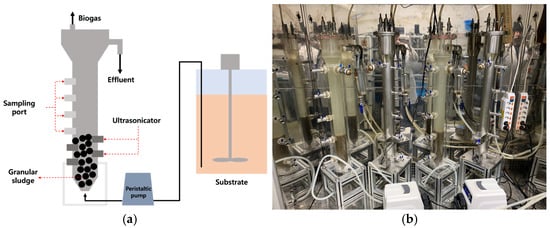 The experimental setup included four laboratory-scale Upflow Anaerobic Sludge Blanket (UASB) reactors operated in parallel with differing treatments (Figure 1). All reactors had a diameter of 70 mm, a height of 930 mm, and a combined vessel volume of 3.8 L. The main reactors were constructed of acrylic, though ultrasound-equipped reactors used stainless steel to mitigate vessel damage. Ultrasonic probe tips were installed at 70 mm intervals on the reactor wall, and five sampling ports were positioned every 170 mm for scheduled sludge sampling. The ultrasound was delivered at a power of 0.1 W/mL in 1 s bursts every 60 s, as previously applied in studies on low- intensity ultrasonication for anaerobic digestion [28].