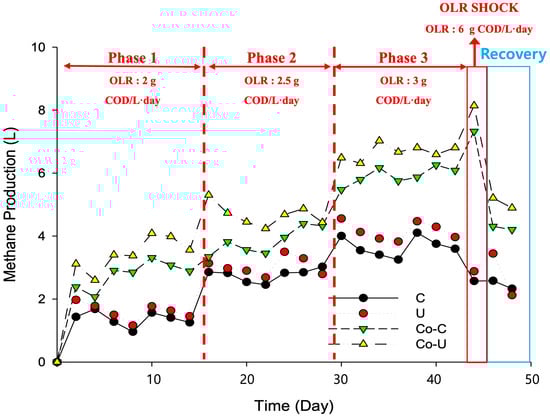 Across the sequential loading phases (Phases 1–3), the system combining co-digestion and ultrasound (Co-U) produced the highest methane yields, followed by co-digestion without ultrasound (Co-C), ultrasound treatment alone (U), and lastly the control (C) (Figure 2). Co-digestion produced 1.3–3.2 times more methane than mono-digestion at equivalent COD input, primarily due to improved nutrient balance and substrate degradability [38,39]. These observations are in line with findings by Neves et al., who also documented increased biogas output when manure was co-processed with additional nutrient-rich materials [40]. Under maximum sustained OLR conditions (Phase 3), ultrasound treatment increased methane yields by 36–44% compared to untreated controls, consistent with prior reports of ~40% improvement under similar low-intensity sonication conditions [28]. Notably, the methane content in biogas consistently ranged from 60–70% across all reactors under stable operating conditions, demonstrating robust methanogenic performance despite increasing feed rates.