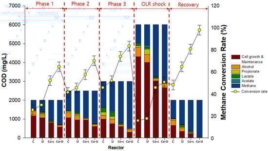 Reactor operation was organized into successive phases as depicted in Table 2. The start-up involved a brief acclimation period using glucose to reactivate microbial communities in the inoculum. Following this step, reactors proceeded at a constant hydraulic retention time (HRT) of 2 days, with the organic loading rates (OLRs) systematically increased across sequential phases. Process stability was further assessed through a shock loading test involving a sudden doubling of the OLR, succeeded by a recovery phase. To maintain pH control, sodium bicarbonate (3 g/L) was dosed as a buffer, and a trace element solution supplied essential micronutrients. Additional characterization of the substrates and seed sludge is available in Figure S1 and Tables S1 and S2 [29].