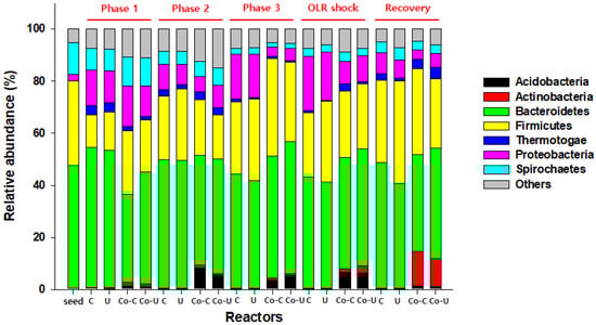 Bacterial communities were dominated by Firmicutes and Bacteroidetes, with Proteobacteria increasing at higher OLR in PW-only reactors, whereas co-digestion favored Acidobacteria and Actinobacteria (Figure 4). Over the course of the experiment, Firmicutes remained prevalent, while Proteobacteria increased in proportion, particularly in piggery wastewater-only reactors at elevated organic loading rates. By the end of the process, C and U reactors exhibited higher levels of Proteobacteria, whereas Co-C and Co-U demonstrated increased proportions of Acidobacteria and Actinobacteria. These observations suggest that incorporating food waste leachate expanded substrate diversity and promoted a richer microbial community structure.