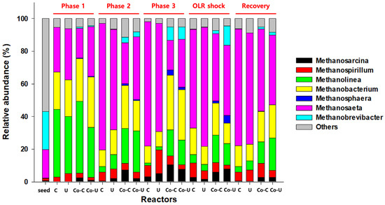 At the genus level, the observed community dynamics illustrated the changes in methanogenic pathways (Figure 5). Methanobrevibacter and Methanosarcina declined in C and U reactors, whereas Methanobacterium and Methanolinea showed substantial increases across all reactors, highlighting hydrogenotrophic methanogenesis as the dominant pathway.
