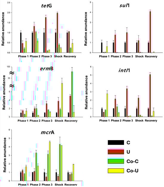 Antibiotic resistance genes were measured using quantitative real-time PCR, and the relative abundance of each gene was determined using the comparative 2−ΔΔCt method. Results are expressed as mean relative abundance values along with standard error, as shown in Figure 6. In the U reactor, which was fed PW and subjected to low-intensity ultrasound, all three target genes exhibited increased abundance compared with the PW-only control reactor. Specifically, the relative abundance values under ultrasound treatment reached approximately 1.98 ± 0.05 for tetG, 4.08 ± 0.16 for sul1, and 4.98 ± 0.38 for ermB.