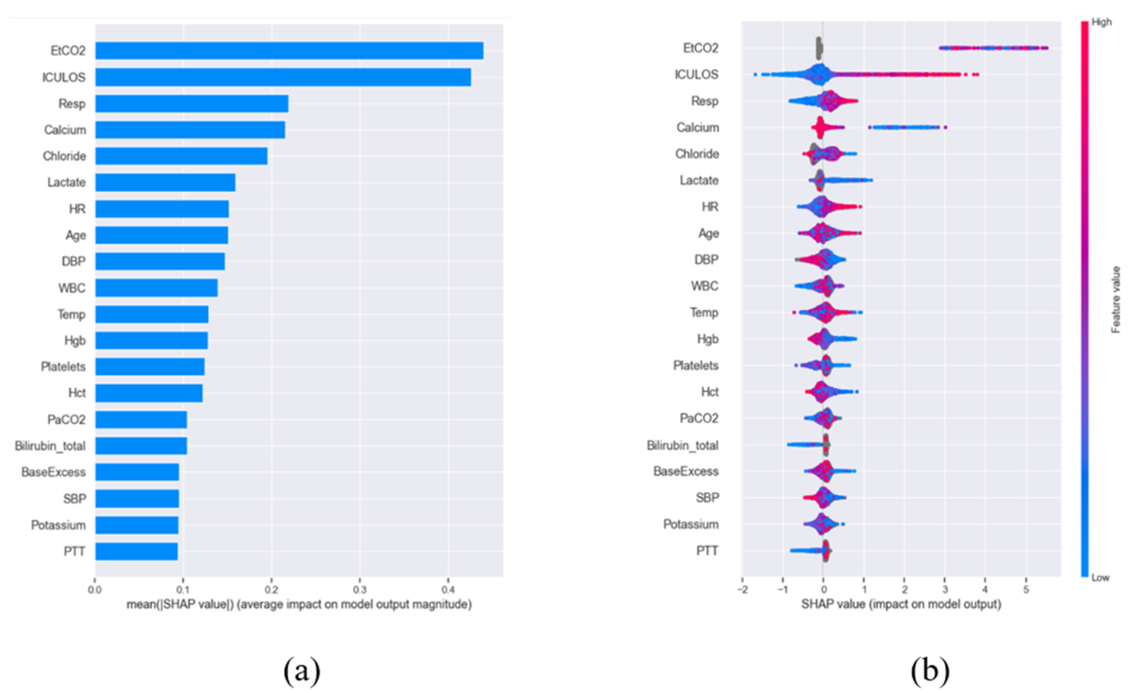 Table 2. Among these, ICULOS (ICU length of stay) emerged as the most critical predictor, followed by HR, Resp, BUN, Calcium, Temp, and blood pressure (SBP/DBP), with the observed effects aligning well with established clinical knowledge (e.g., lower blood pressure is associated with elevated sepsis risk). By providing transparency in model decision-making, these findings enhanced clinical interpretability and improved confidence in the system’s use, thereby addressing the “black-box” challenge in medical AI [