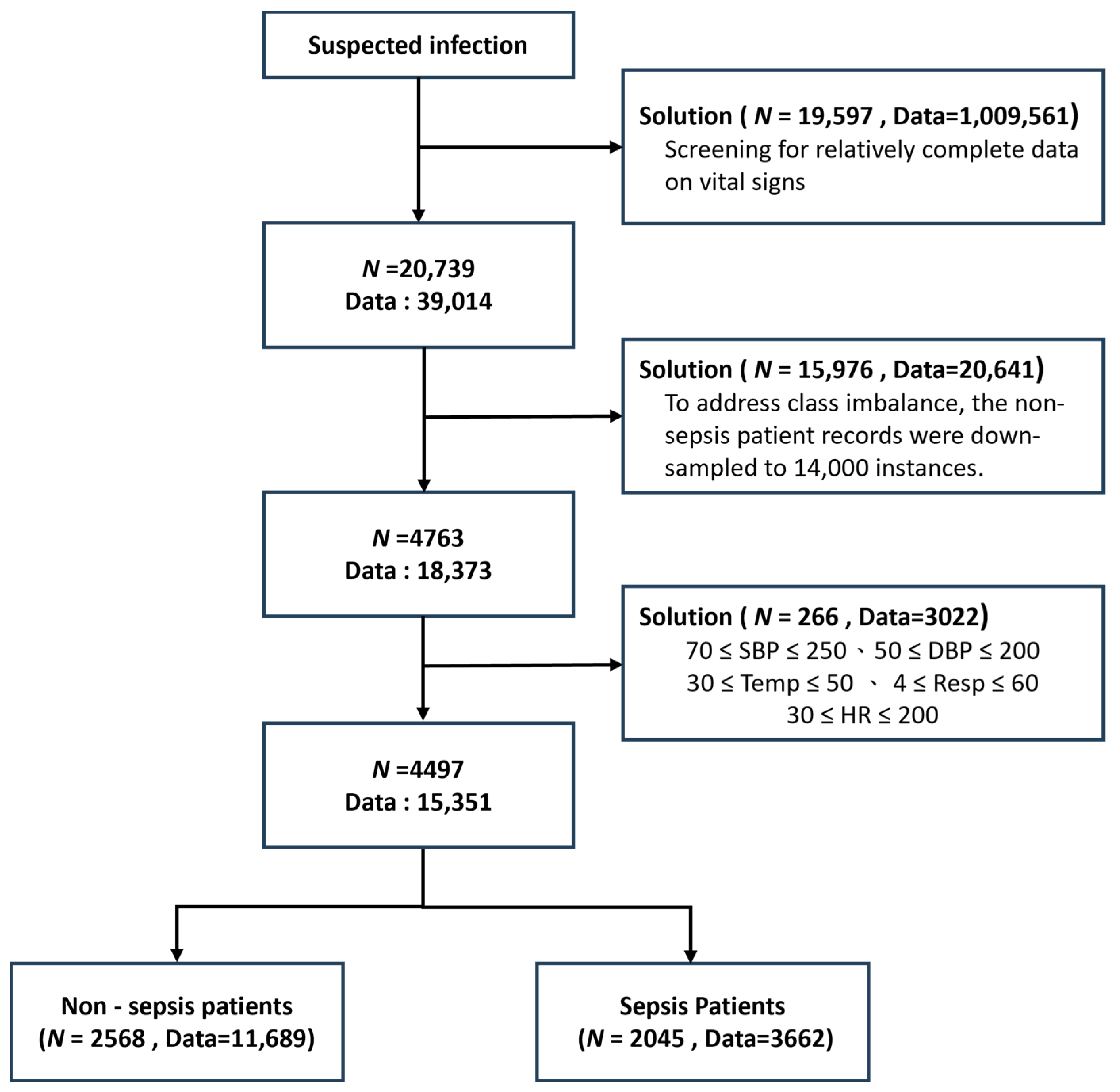 N = 20,739 patients, 39,014 records) to ensure sufficient clinical information and maintain data quality. As a result, a relatively complete dataset was obtained. In the original dataset, 34,641 records belonged to non-sepsis patients, whereas only 4373 records were associated with sepsis patients. This substantial class imbalance was recognized as a potential threat to model performance; therefore, the non-sepsis records were down-sampled to 14,000 instances to produce a more balanced dataset. Furthermore, the extreme values of each vital sign feature were examined, and clearly abnormal data were removed to minimize undue influence on model training, which is particularly important for clinical variables susceptible to measurement errors. After this curation, the final dataset consisted of 2568 non-sepsis patients (11,689 records) and 2045 sepsis patients (3662 records), thereby achieving both clinical relevance and statistical robustness (