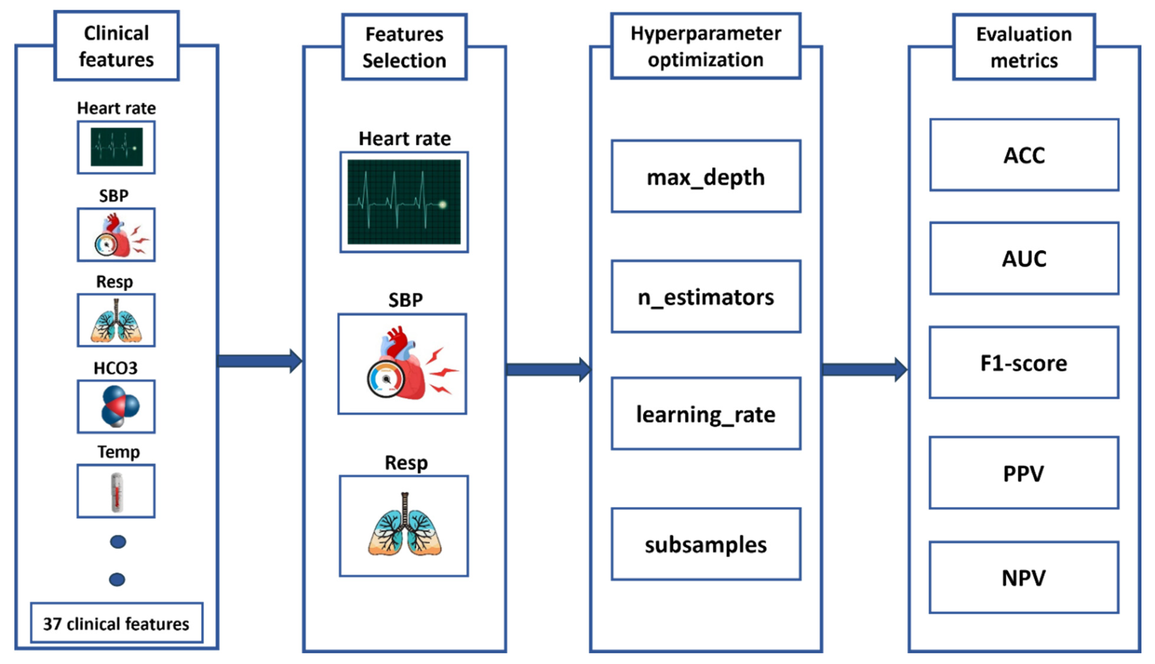 20] for robust hyperparameter tuning, ensuring optimal model performance and generalizability across diverse patient populations. To provide a comprehensive evaluation of clinical utility, we assess model performance using seven complementary metrics: Accuracy and ROC-AUC for overall discriminative ability, F1-score for class imbalance adjustment, Positive and Negative Predictive Values (PPV, NPV) for clinical decision support, and Sensitivity and Specificity to evaluate critical diagnostic performance. This multifaceted evaluation framework is specifically designed to address the complex clinical requirements of sepsis prediction, where both false negatives (missed cases) and false positives (alert fatigue) carry substantial consequences. By comparatively evaluating multiple state-of-the-art algorithms through this rigorous framework, our study provides evidence-based guidance for implementing machine learning solutions in clinical settings, while significantly advancing the field of automated sepsis prediction through its balanced consideration of predictive performance, clinical relevance, and practical implementation requirements.