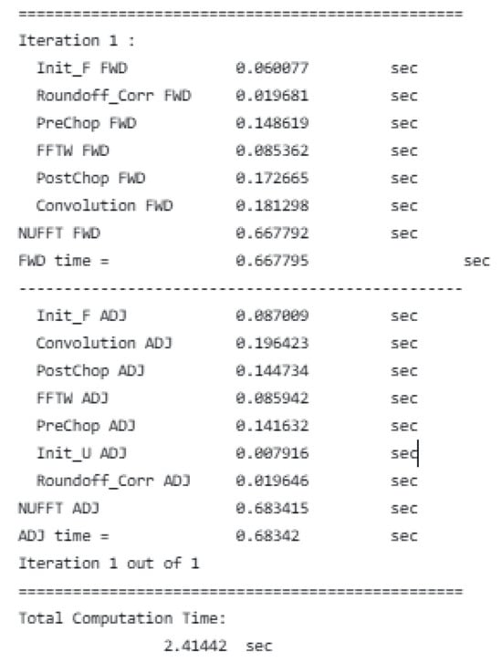 Typical NUFFT-based iterative solvers use two NUFFT operators: Forward NUFFT (FWD) and Adjoint NUFFT (ADJ). The Forward NUFFT operates by applying a scaling function to the signal of interest, transforming the signal onto a uniformly spaced (i.e., Cartesian) spectral grid by means of an (oversampled) FFT, and then judiciously interpolating that signal onto the desired set of non-uniformly spaced (i.e., non-Cartesian) indices. The program uses two key operators for the NUFFT algorithm: The Forward NUFFT (FWD) and the Adjoint NUFFT (ADJ). The calculation process of the FWD operator can usually be divided into three steps: