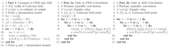 As shown in Figure 2, each convolution kernel consists of two parts. For a given sample point p, with coordinates (wx[p], wy[p], wz[p]), the first part computes interpolation kernel coefficients, winX, winY, and winZ, using table LUT look-up. It also computes x, y, and z coordinates of the neighbors in the convolution window, kx, ky, and kz. The second part performs actual convolution, where forward convolution accumulates weighted values from the Cartesian grid into the sample value and adjoint convolution spreads the sample value onto the Cartesian grid, as shown in Figure 2. In the actual program code of this paper, the pseudo code for the ADJ operator and FWD operator calculations are shown in Figure 2, which includes the common part 1 of the two operators, as well as the unique parts part2a and part2b. Preliminary analysis shows that the FWD operator can be directly parallelized, while the ADJ operator contains dependencies and cannot be directly parallelized.