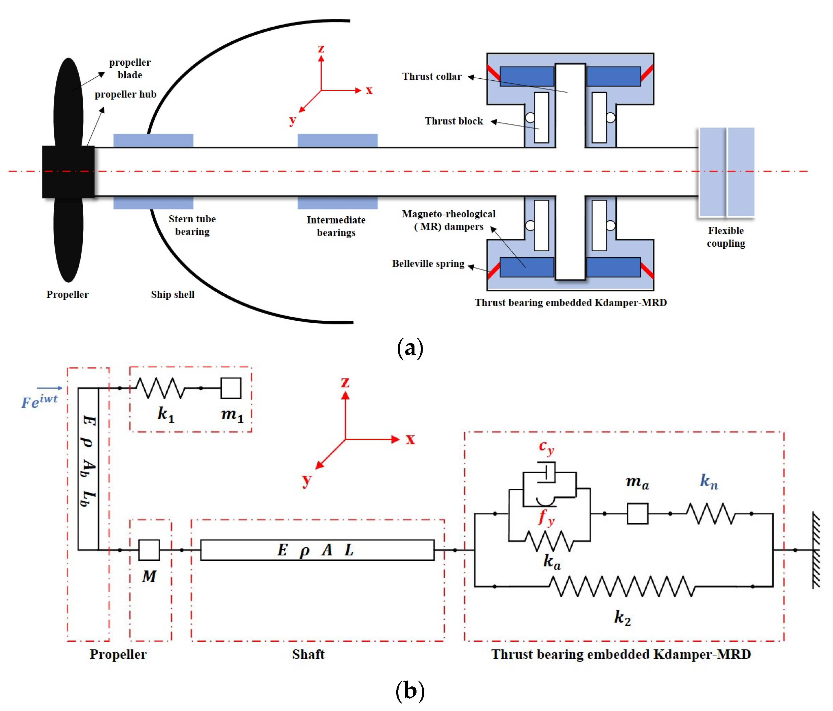 This study aims to reduce the longitudinal vibration of the propulsion shaft system caused by the propeller, proposing a Kdamper-MRD that can be used for semi-active vibration control, and validate its vibration reduction performance through a combination of theoretical analysis and simulation analysis. The paper is organized as follows. The analysis of longitudinal vibration characteristics of the propulsion shafting system is conducted in