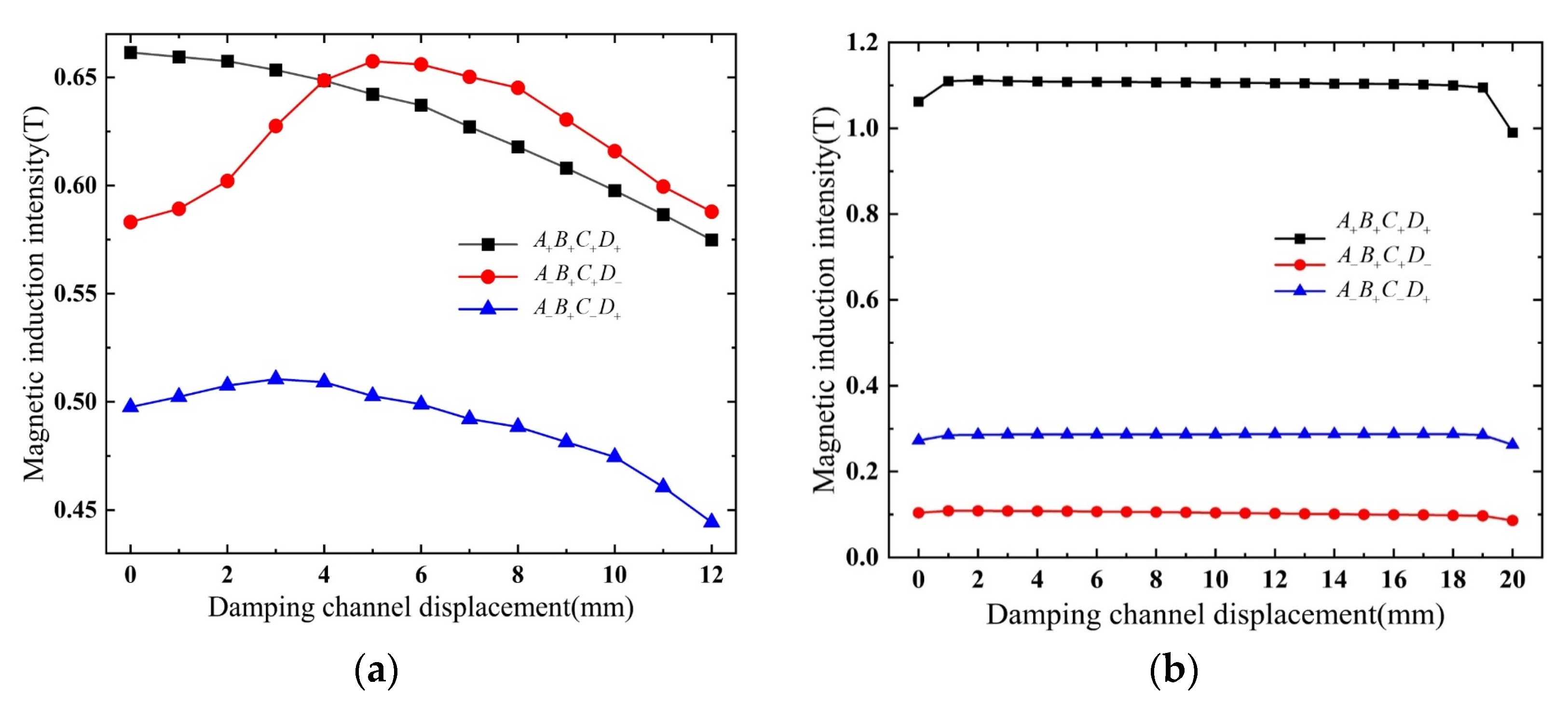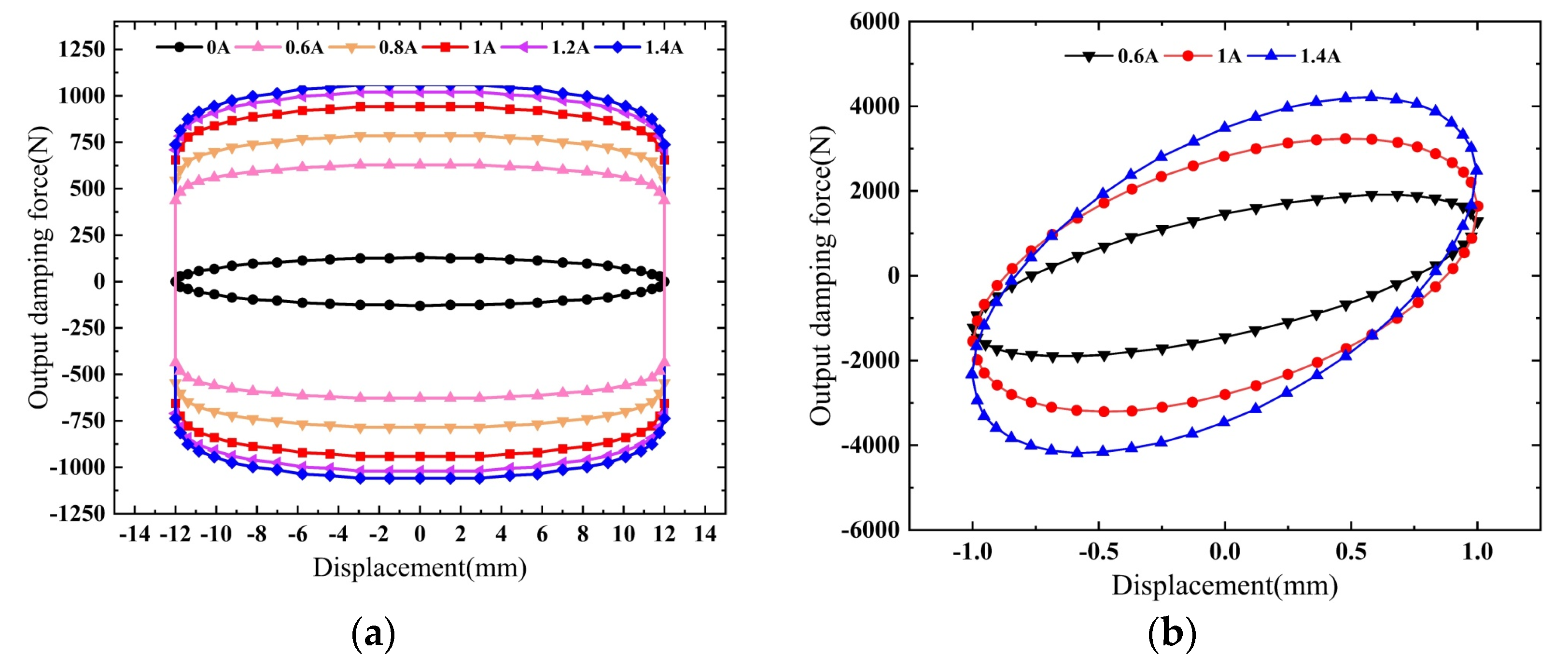 Figure 5. The Kdamper-MRD mainly comprises a piston rod, piston head, excitation coil, cylinder body, end cover, end cover, Belleville spring, and load-bearing pad. The middle thread of the piston rod 1 connects the left and right parts, and the piston head 5 is fastened in the middle of the piston rod 1. The excitation coil of the piston 12 is evenly wound around the winding groove on the piston head 5. The excitation coil of the cylinder body 11 is first evenly wound around the magnetic isolation ring 10, then installed on the sealing ring 3, and fixed with screws. Sealing rings 3 are placed between the piston rod 1 and the upper and lower end caps 2. The end cover 13 is equipped with oil injection holes 9 for the regular inspection of the magnetorheological fluid. Belleville springs 6 are installed in a mating form on the right end cover 13, and its pre-displacement is adjusted by the fastening nut 8.