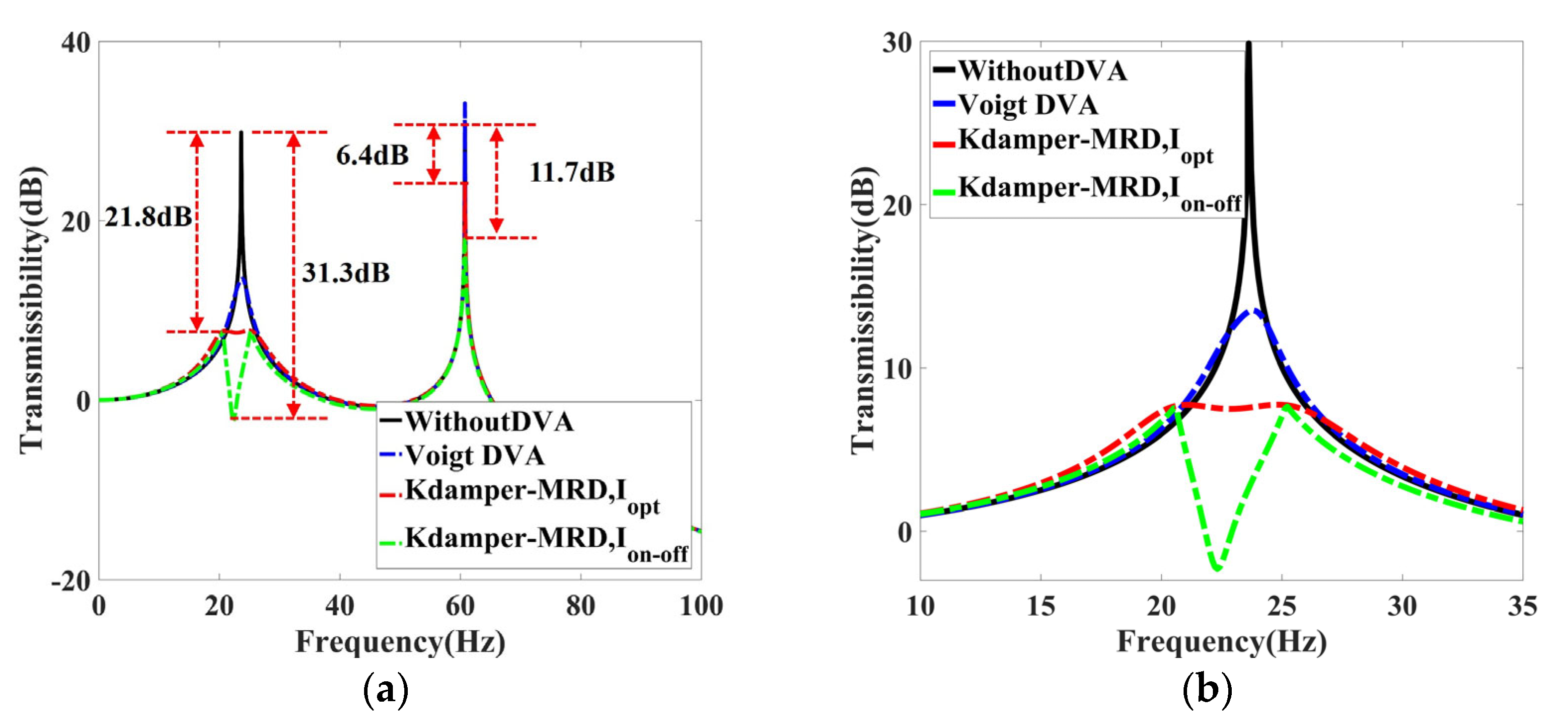30] first proposed and named this concept as the Kdamper (or DVA with negative stiffness, DVANS), compared its damping performance with the Voigt DVA, and verified that the Kdamper can ensure a sufficient damping performance while reducing the additional tuning mass, as shown in