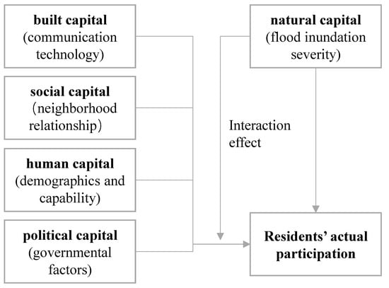 Furthermore, natural capital (e.g., flood inundation severity) also directly impacts participation, as the immediate threat can heighten perceived risk and urgency. Crucially, the framework emphasizes an interaction effect between natural capital and the other four capitals. This suggests that the severity of a flood event is not an isolated determinant; rather, its impact on participation is significantly modulated by the existing levels of built, social, human, and political capital. For example, a severe flood might elicit a more organized and effective community response if supported by robust communication infrastructure and strong neighborhood networks. This comprehensive approach highlights that residents’ engagement in relief efforts is a complex interplay of direct influences and critical synergistic effects between environmental factors and various forms of community capital.