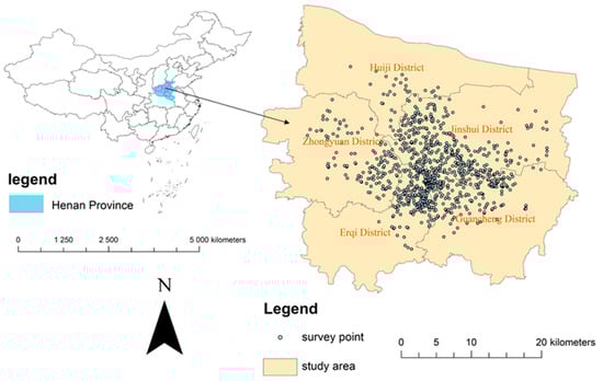 A total of 1500 questionnaires were distributed, and after excluding invalid or incomplete responses, 1322 valid questionnaires were retained for analysis (see Figure 2), yielding an effective response rate of 88.1%. The combination of paper-based administration, in-person guidance, and community coordination contributed to the high response rate. The spatial distribution of the survey respondents is detailed in Figure 2. Note that the surveyed sample closely reflects the overall population of Zhengzhou. In terms of age distribution, individuals under 18 account for 16.36%, those aged 18 to 50 represent 78.54%, and those over 50 comprise 5.1%. The gender ratio is 54.92% female to 45.08% male. These age and gender characteristics are highly consistent with Zhengzhou’s population structure.